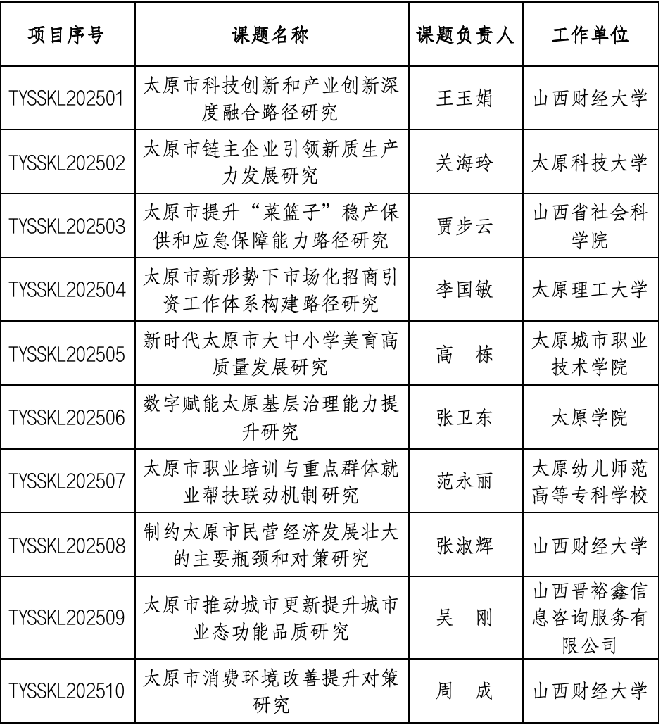 2025年度太原社會科學(xué)創(chuàng)新資金資助項目擬立項名單