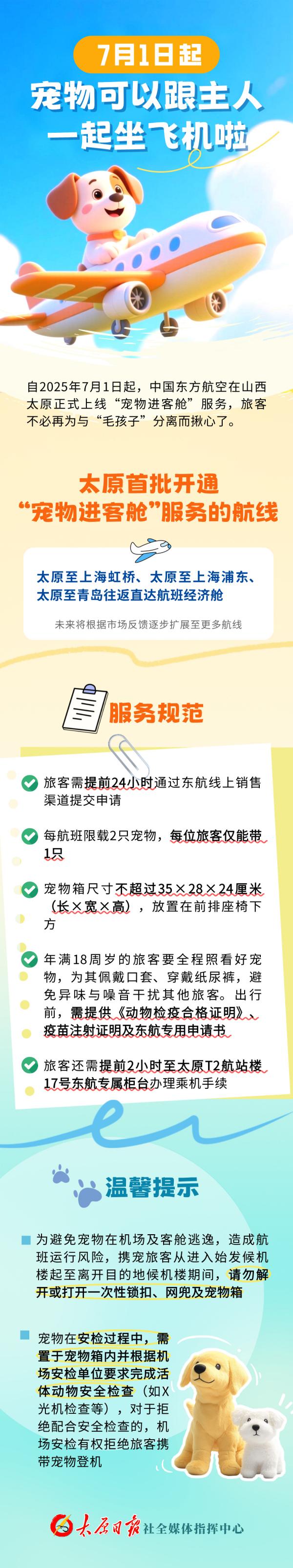7月1日起,中國東方航空將在太原武宿國際機場正式推出“寵物進客艙”特色服務,為旅客提供與愛寵同機出行的全新體驗。該服務如何申請、覆蓋哪些航線?一起來看。