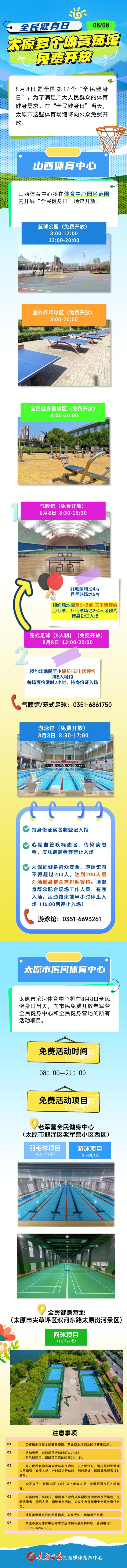 8月8日是全國第17個“全民健身日”,為了滿足廣大人民群眾的體育健身需求,在“全民健身日”當天,太原市這些體育場館將向公眾免費開放。