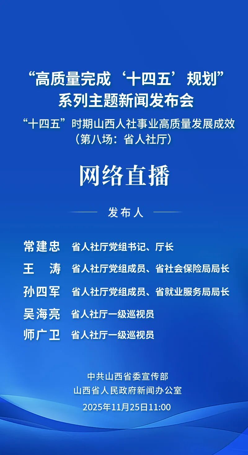 2025年11月25日上午11時,中共山西省委宣傳部、山西省人民政府新聞辦公室將舉行“高質量完成‘十四五’規劃”系列主題第八場新聞發布會。省人社廳有關負責同志將介紹“十四五”時期全省人社事業高質量發展成效,并答記者問。