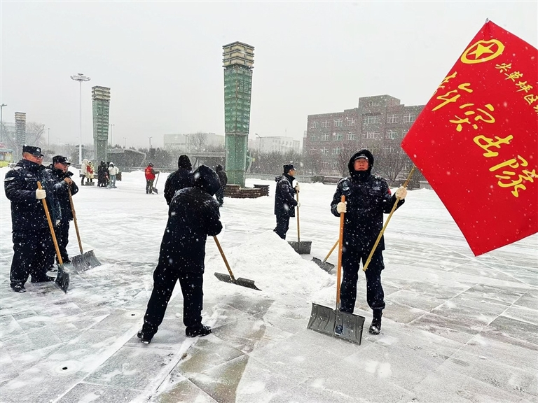 婁煩縣城人行道及市民廣場,黨員干部、社區工作者與志愿者們組成的紅色志愿服務隊格外醒目。他們手持鐵鍬、推雪板,逐步擴大清掃范圍,為出行群眾清理出安全通道。